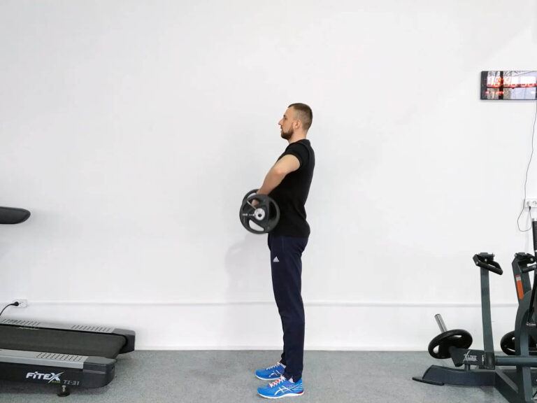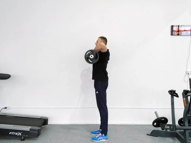 - Підніміть штангу до рівня грудей або трохи вище, щоб лікті були на одному рівні або трохи вище плечей.
